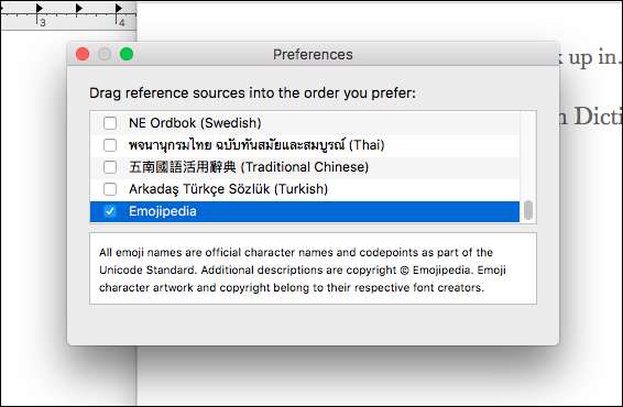 इसके बाद, शब्दकोश को फायर करें, जो आपको एप्लिकेशन फ़ोल्डर में मिलेगा। डिक्शनरी में प्रमुख> मेनू बार में प्राथमिकताएं, तब तक नीचे स्क्रॉल करें जब तक कि आप इमोजीपी न पाएं।