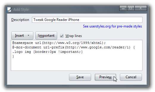 जो भी कारण हो, Google रीडर लोगो के पास यह कष्टप्रद नीली सीमा है, लेकिन हम इसे एक त्वरित स्टाइलिश स्क्रिप्ट के साथ निकाल सकते हैं।