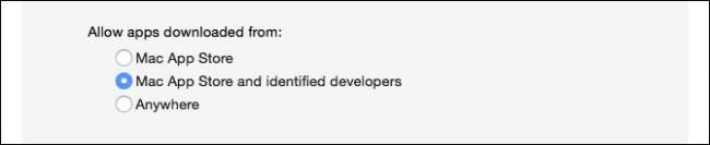 नीचे दिया गया अनुभाग वास्तव में महत्वपूर्ण है क्योंकि यह आपको यह निर्धारित करने देता है कि कौन से ऐप इंस्टॉल किए जा सकते हैं। आप इसे करने के लिए विवश कर सकते हैं केवल मैक ऐप स्टोर ऐप , ऐप स्टोर और ऐप्पल ने "पहचाने गए डेवलपर्स," या कहीं से भी ऐप को मंजूरी दे दी।