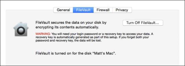 OS X की एन्क्रिप्शन सुविधा को FileVault कहा जाता है, और इसे "FileVault" टैब पर सक्षम किया जा सकता है।