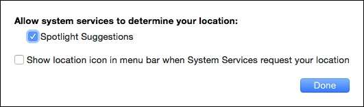 स्थान-आधारित बंद करने के लिए "सिस्टम सेवा" के बगल में "विवरण ..." बटन पर क्लिक करें स्पॉटलाइट सुझाव । आप भी कर सकते हैं मेनू बार आइकन दिखाएं जब सिस्टम सेवाएँ आपके स्थान का अनुरोध करती हैं।
