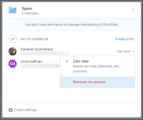 यह नरक है: आप कुछ भी नहीं कर सकते हैं आप अपने साथ फ़ाइल या फ़ोल्डर साझा करने से लोगों को रोक नहीं सकते हैं, और आप एक बार आने के बाद अपने आप को शेयरों से हटा नहीं सकते हैं (फिर से, यह केवल लागू होता है यदि फ़ाइल "केवल देखने के लिए" सेट है)।