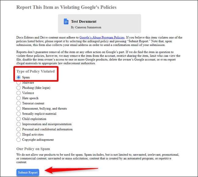 अगले पृष्ठ पर, "स्पैम" का चयन उस उल्लंघन के रूप में करें जिसकी आप रिपोर्टिंग कर रहे हैं। "रिपोर्ट सबमिट करें" और उस पर क्लिक करें। फ़ाइल अभी भी आपके ड्राइव में होगी, और यह स्पष्ट नहीं है कि Google इस जानकारी के साथ क्या करता है। मैंने एक फ़ाइल की सूचना दी, और यह अभी भी चार दिन बाद मेरी ड्राइव में था, इसलिए इसके साथ आप क्या करेंगे।