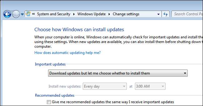अभी के लिए, आप बदल सकते हैं कि विंडोज अपडेट कैसे स्थापित करता है। प्रारंभ बटन पर क्लिक करें और "विंडोज अपडेट" टाइप करें। साइडबार में "सेटिंग्स बदलें" पर क्लिक करें और "मुझे महत्वपूर्ण अपडेट प्राप्त होने पर उसी तरह अनुशंसित अपडेट दें" विकल्प को अनचेक करें। यह होना चाहिए विंडोज 10 को स्वचालित रूप से डाउनलोड करने से विंडोज 7 या 8.1 को रोकें .