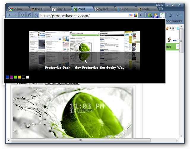 जैसे ही आपने एक्सटेंशन स्थापित किया है आप जाने के लिए तैयार हैं। अपने खुले टैब के माध्यम से ब्राउज़ करने के लिए बस ड्रॉप-डाउन विंडो खोलने के लिए "टूलबार बटन" पर क्लिक करें। आपको निचले बाएँ कोने में अपने खुले टैब और "पृष्ठभूमि रंग चयनकर्ता विकल्प" के थंबनेल दिखाई देंगे। टैब के माध्यम से स्क्रॉल करने के लिए अपने "मध्य माउस बटन" का उपयोग करें और उस पर क्लिक करें जिसे आप देखना चाहते हैं। इसके लिए वहां यही सब है…