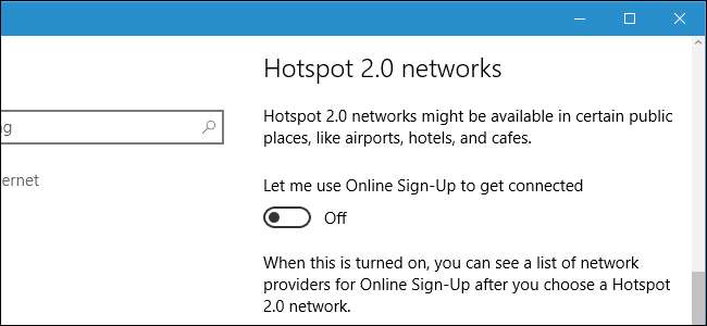 चाहे आप किसी हॉटस्पॉट 2.0 नेटवर्क से कनेक्ट करें या समय से पहले ही प्रोफाइल स्थापित करें, इसे "बस काम" करने के लिए डिज़ाइन किया गया है। विंडोज 10 एक "ऑनलाइन साइन-अप" सुविधा प्रदान करता है जो आपको नेटवर्क प्रदाताओं की सूची के साथ पेश करेगा जब आप पहली बार हॉटस्पॉट 2.0 नेटवर्क में शामिल होने का प्रयास करेंगे। आपके द्वारा इसे एक बार सेट करने के बाद, आपका डिवाइस अपने आप भविष्य में अन्य हॉटस्पॉट 2.0 नेटवर्क से कनेक्ट हो जाएगा।