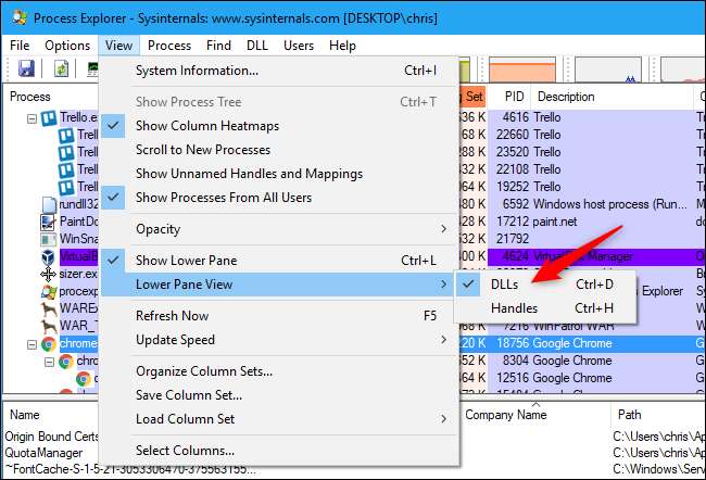 यदि आप ऐसा करना चाहते हैं तो प्रोसेस एक्सप्लोरर को डाउनलोड और चलाएं। दृश्य> निचला फलक दृश्य> DLL पर क्लिक करें या Ctrl + D दबाएं।