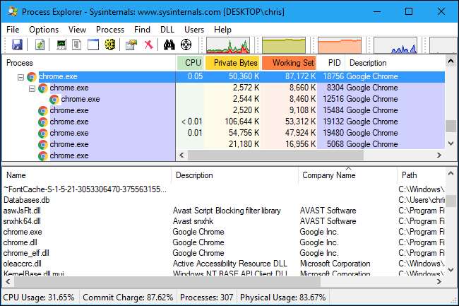 शीर्ष फलक में एक प्रक्रिया का चयन करें और लोड किए गए DLL को देखने के लिए निचले फलक में देखें। "कंपनी का नाम" कॉलम इस सूची को फ़िल्टर करने का एक उपयोगी तरीका प्रदान करता है।