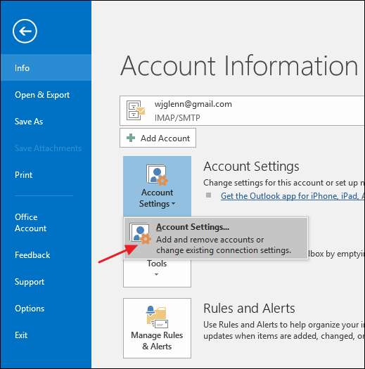 आप यह भी पता लगा सकते हैं कि आउटलुक के लिए पीएसटी फ़ाइल ईमेल खाते में कहाँ से संग्रहीत है। आउटलुक 2010, 2013 और 2016 में, "फ़ाइल" मेनू पर क्लिक करें, "खाता सेटिंग" ड्रॉपडाउन मेनू चुनें, और उसके बाद "सेटिंग्स" चुनें। Outlook 2007 में, आपको "टूल" मेनू पर "खाता सेटिंग" विकल्प मिलेगा।