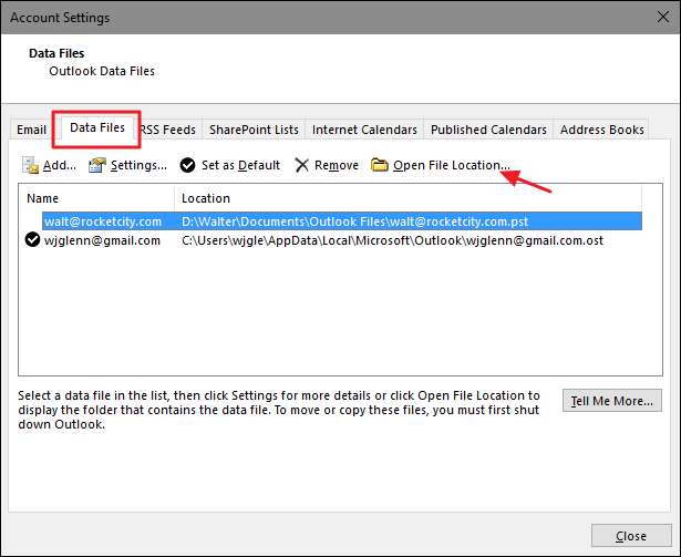 "खाता सेटिंग" विंडो में, "डेटा फ़ाइलें" टैब पर, उस खाते का चयन करें जिसे आप जांचना चाहते हैं और फिर "फ़ाइल स्थान खोलें" बटन पर क्लिक करें।