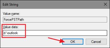 ) यह मान गुण विंडो खोलने के लिए और उस स्थान को टाइप करें जहाँ आप चाहते हैं कि आउटलुक "मूल्य डेटा" बॉक्स में नई डेटा फ़ाइलों को संग्रहीत करे। ठीक होने पर क्लिक करें।
