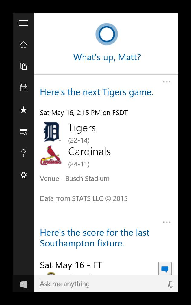 Cortana आपको एक क्लिक पर बहुत सारे सामान पर एक त्वरित नज़र प्रदान करता है। थोड़ा समय उसे बताएं कि आप क्या कर रहे हैं, और आपको अच्छी तरह से पुरस्कृत किया जाएगा। जैसे के खेल? कॉर्टाना आपको बताएगा कि अगला गेम कब है, वर्तमान स्कोर क्या है या आपकी टीम विजयी थी या नहीं। खबर में दिलचस्पी है? आप उन समाचार विषयों के लिए शीर्ष सुर्खियाँ दिखाएंगे जो आप में रुचि रखते हैं। मौसम का अद्यतन? उसे यह प्राप्त हो गया है।