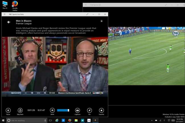 विंडोज 10 आपको "विंडो" मेट्रो / आधुनिक एप्लिकेशन, "विंडोज" नामक एक ऑपरेटिंग सिस्टम में एक उपन्यास अवधारणा की अनुमति देता है। यहाँ पर मुख्य बात यह है कि मैं काम करने के लिए अपने कंप्यूटर का उपयोग जारी रखते हुए फॉक्स स्पोर्ट्स गो पर एक स्पोर्टिंग इवेंट में सुन सकता हूँ। एप्लिकेशन अब एक स्क्रीन पर पूर्ण शासनकाल की मांग नहीं करता है।