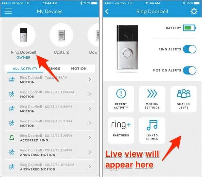 यदि आपके पास आपकी रिंग यूनिट आपके मौजूदा डोरबेल की वायरिंग तक है, तो आप अपने फोन पर रिंग ऐप खोलकर लाइव व्यू एक्सेस कर सकते हैं, टॉप-लेफ्ट कॉर्नर में अपनी रिंग डोरबेल यूनिट पर टैप करें और फिर "लाइव व्यू" पर टैप करें। "अगली स्क्रीन पर बॉक्स।
