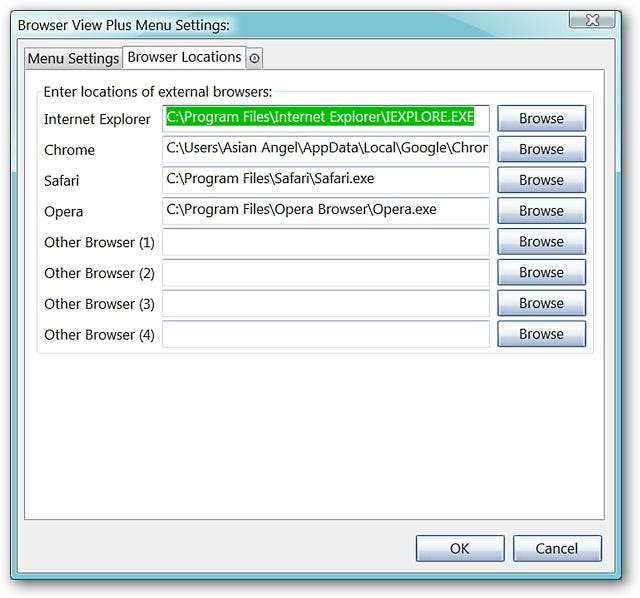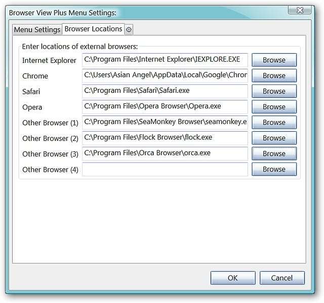 A második fülön láthatja, hogy a Browser View Plus kiterjesztés észlelte, hogy mind a négy alapértelmezett böngésző telepítve van a példarendszerünkön, és már létrehozta a célútvonalakat.