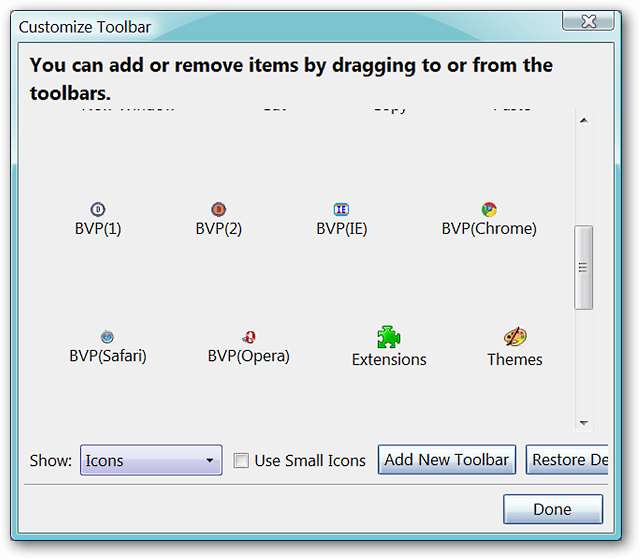 Ideje hozzáadni ezeket az eszköztár gombjait! Kattintson a jobb gombbal a böngésző eszköztárára, és válassza a testreszabás lehetőséget. Összesen hat gomb érhető el (mindegyikben a név részeként BVP szerepel), amelyeket hozzáadhat az egyik eszköztárhoz. Helyezze őket oda, ahol az Ön igényeinek leginkább megfelel.