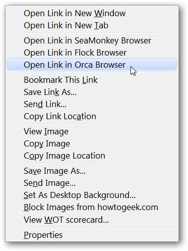 Példának okáért három böngészőt választottunk (mindegyik egyedi), amelyek a Jobb kattintás menüben jelennek meg… SeaMonkey, Flock és Orca. Figyelje meg, hogy a három elrejtésének opciója nincs kiválasztva, és a negyedik böngészőbe a „Nincs” lehetőséget választotta.