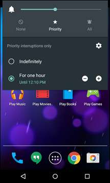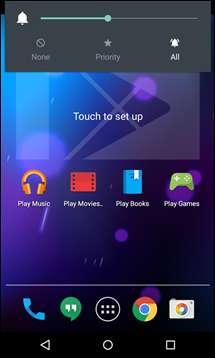 A Lollipop megjelenésekor a Google megváltoztatta a dolgokat. Amikor teljesen lecsendesítette a hangerőt, a „csak rezgés” ponton állt meg - nem volt „csendes” beállítás. De! A hangerő csúszka alatt megjelent egy új opció: „Nincs”, „Prioritás” és „Mind”. Ezek voltak az új Ne zavarjanak beállítások, és milyen nagy felhajtást váltottak ki.