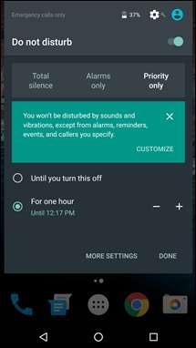 A „Prioritás” vagy a „Nincs” opció megérintésével a már összezavarodott felhasználó párosra mutat opciók: „Határozatlan ideig” és „A X időtartam . ” Attól függően, hogy melyik beállítást választotta, ez vagy figyelmen kívül hagyja az összes értesítést - hívásokat, szöveges üzeneteket, naptári eseményeket stb. - a megadott ideig, vagy lehetővé teszi a felhasználó által meghatározott prioritási értesítések átadását. Hogy őszinte legyek, összemosódott rendetlenség volt. Mivel annak meghatározása érdekében, hogy mit jelent a „prioritás” számodra, be kellett utaznod a Beállítások menübe (erről bővebben a következő szakaszban olvashatsz).