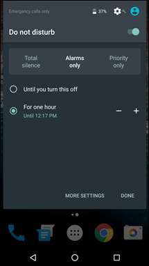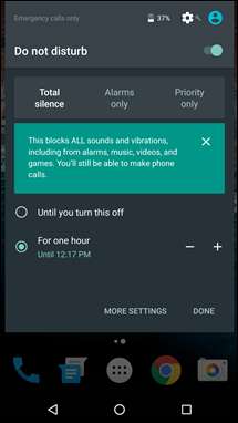 Engedélyezheti azonban a Ne zavarjanak lehetőséget a Gyorsbeállítások menüből, további opciókkal. Lehetősége van a „Teljes csend”, a „Csak riasztások” és a „Csak prioritás” lehetőségekre, és időkorlátokat állíthat be arra, hogy meddig tartson a Ne zavarjanak funkció.