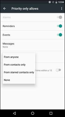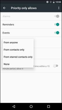 Alapvetően az Android néhány különböző módon határozza meg az értesítéseket: Riasztások, Emlékeztetők, Események, Üzenetek és Hívások. Ha a Beállítások> Hangok> Ne zavarjanak lehetőségre lépjen, kiválaszthatja, hogy mely típusú értesítések legyenek „prioritások”. Az üzenetek még részletesebb vezérlést kínálnak, lehetővé téve, hogy bizonyos névjegyeket prioritásként állítson be, így életének legfontosabb emberei akkor is elérhetik Önt, ha a Ne zavarjanak funkció be van kapcsolva.