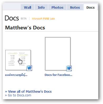 Miután bejelentkezett a Docs.com webhelyre, egy új opcionális lap jelenik meg Facebook-profilján. Válaszd ki a Dokumentumok linkre kattintva megmutathatja megosztott és nyilvános dokumentumait barátainak.