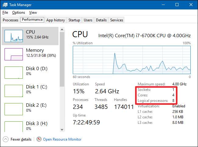 A Windows Feladatkezelője ezt elég jól mutatja. Itt láthatja például, hogy ennek a rendszernek egy tényleges CPU-ja (foglalata) és négy magja van. A hyperthreading révén az egyes magok két CPU-nak tűnnek az operációs rendszer számára, így 8 logikai processzort mutat.