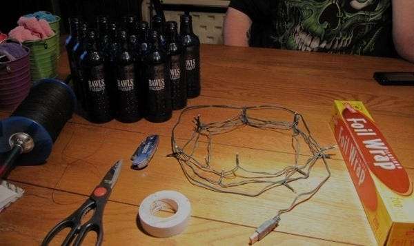 Először az üvegek belső nyakát béleltük ki egy kis alumínium fóliával, hogy a fény lefelé irányuljon. Apró, 1 ”x 2” méretű fóliadarabokat vágtunk, szorosan feltekertük, a hátukba egy kis szalagot tettünk, és az üveg nyakába tettük.