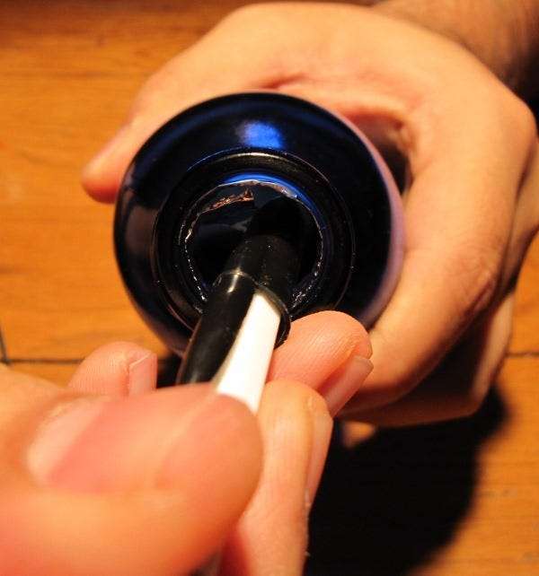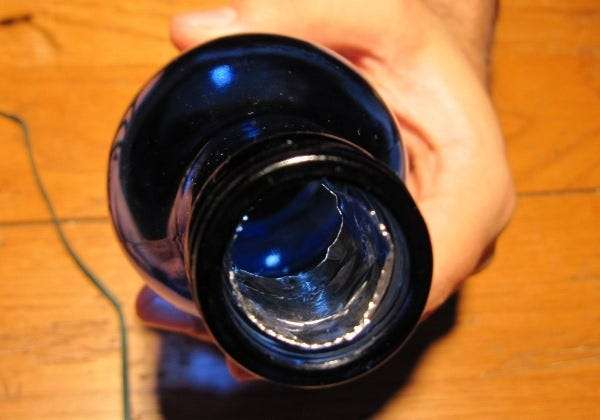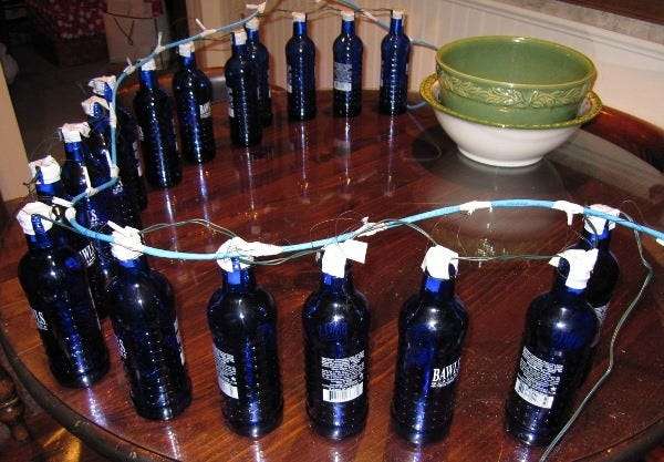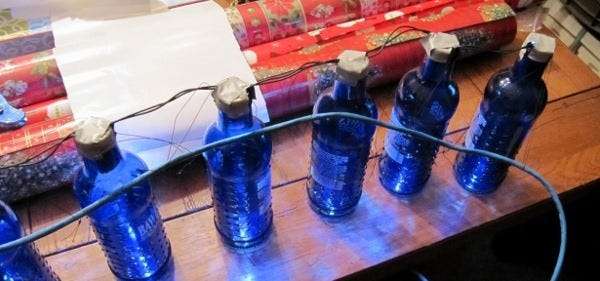 Mint fent említettük, egy sor fehér USB LED lámpát használtunk (a thinkgeek.com-tól), mert jól működtek a kék Bawls palackokkal, de bármilyen lámpa működik. Eldobtuk a lámpákat az üvegekbe, és összeragasztottuk őket.