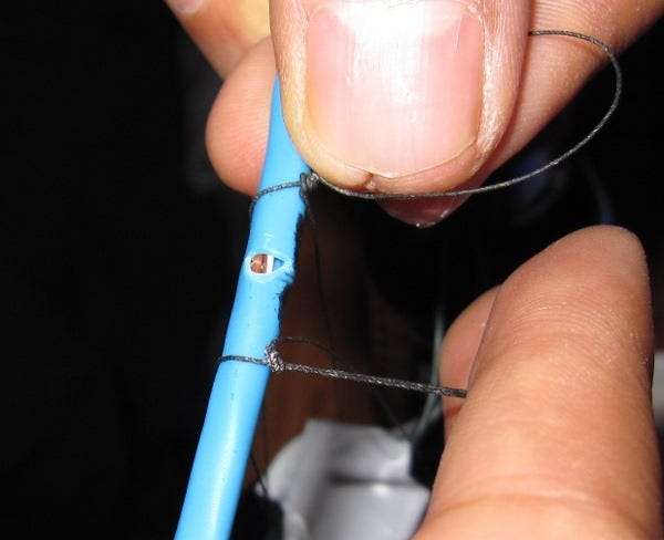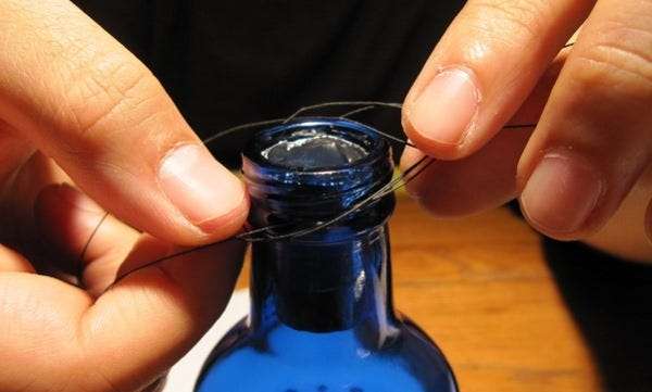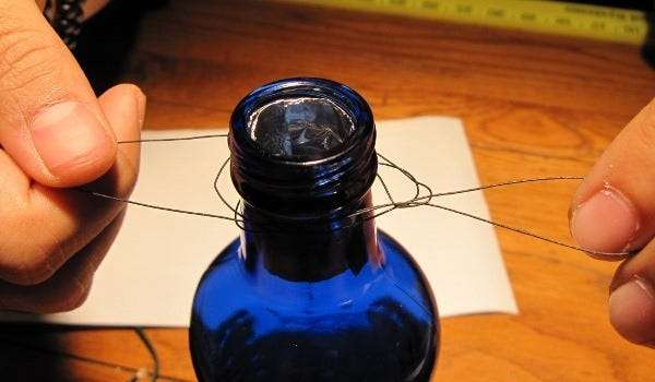 Ezután a vékony zsinór egy részét az üvegek köré tettük, hogy felakasszuk őket. Volt egy nagy teherbírású sárkányrepülő fonál, de a fonott damil olcsó és ugyanolyan jól működik. Megkötöztem a palack heveder csomót , amelyet úgy terveztek, hogy illeszkedjen egy üveg ajka alá, és nagyon masszív.