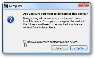 A Kindle megerősíti, hogy törölni kívánja a számítógépet. Ne feledje, hogy a letöltött e-könyveket újra le kell töltenie, amikor újraaktiválja a Kindle-t, ezért ellenőrizze Távolítsa el az összes licencelt tartalmat erről az eszközről , majd kattintson a gombra Regisztráció törlése .