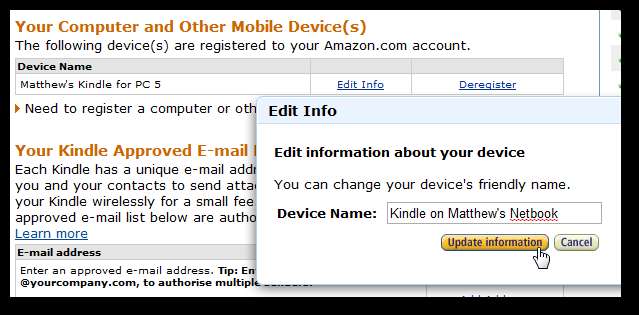 Ha szeretné könnyebben megjegyezni, melyik számítógép melyik a Kindle-on, kattintson a gombra Információ szerkesztése a készülék egyedi nevének megadásához. Írja be, amit csak akar, és kattintson Információk frissítése .