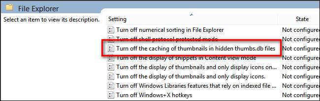Ezután mindhárom operációs rendszer felhasználójának meg kell néznie a jobb oldali panelen, ahol a konfigurációs beállítások vannak felsorolva, és a beállításokat név szerint kell rendezni, a fenti képernyőképen látható Beállítás oszlop címére kattintva. Keresse meg a „Bélyegképek gyorsítótárának kikapcsolása a rejtett thumbs.db fájlokban” bejegyzést, és kattintson rá duplán.