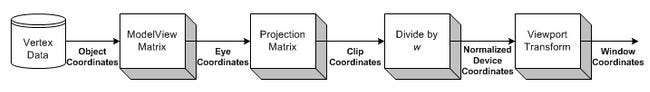A transzformáció az a rész, ahol az összes bemeneti koordinátát (háromszögünk csúcsait) megkapjuk és a ModelView mátrixot alkalmazzuk. Ez az a mátrix magyarázza hogy a mi modell (a csúcsokat) elforgatják, méretezik és lefordítják (mozgatják).