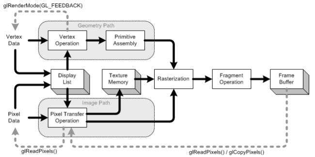Sokféleképpen rajzolhatunk háromszöget a képernyőn. Tegyük fel, hogy az egyszerűség kedvéért nem használtunk csúcspuffereket. (A csúcspuffer egy olyan memóriaterület, ahol koordinátákat tárol.) Tegyük fel, hogy a program egyszerűen elmondta a grafikus feldolgozó folyamatnak minden egyes csúcsot (egy csúcs csak egy koordináta a térben) egy sorban.