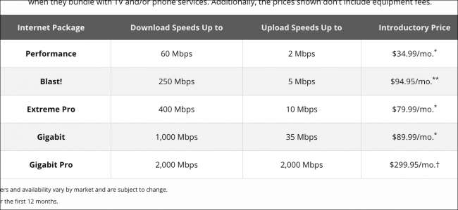 Az internetszolgáltató által kínált tervek korlátozottak lesznek. Általában a letöltési sebességet hirdetik, és neked kell ásni, hogy megtaláld a feltöltési sebességet. Az Xfinity itt „gigabites” internetet értékesít, de csak „legfeljebb” 35 Mbps feltöltést biztosít. Ez 965 Mb / s félénk, hogy gigabites.