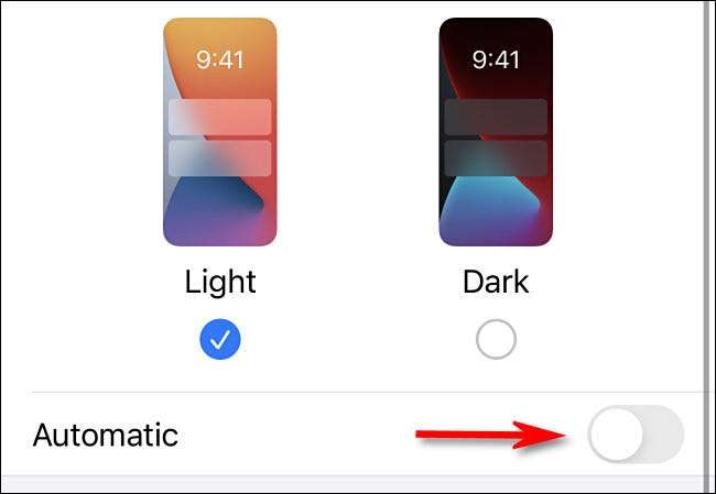 A "Megjelenés" szakasz alatt, ahol választhat a fény és a sötét üzemmódok között, érintse meg a kapcsolót az "Automatikus" mellett, hogy bekapcsolja.