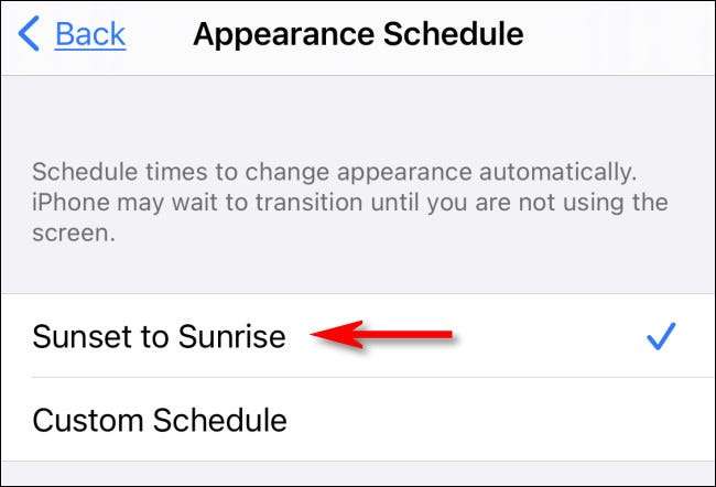 A "Megjelenés ütemterv" oldalán győződjön meg róla, hogy a "Sunset to Sunrise" megérinti.