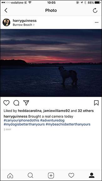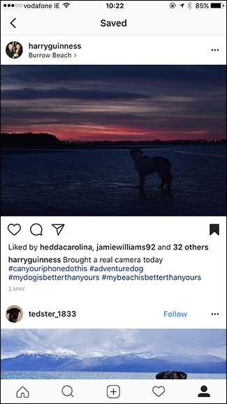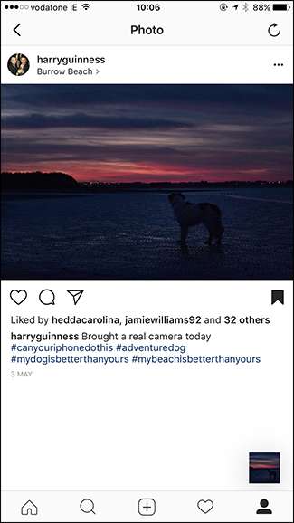 Nyissa meg az Instagram-ot, és keressen meg egy fényképet, amelyet később menteni szeretne. Bárki fotóit elmentheti, akár a sajátját is, ezért ezt a lövést használom a kutyámról a tengerparton.