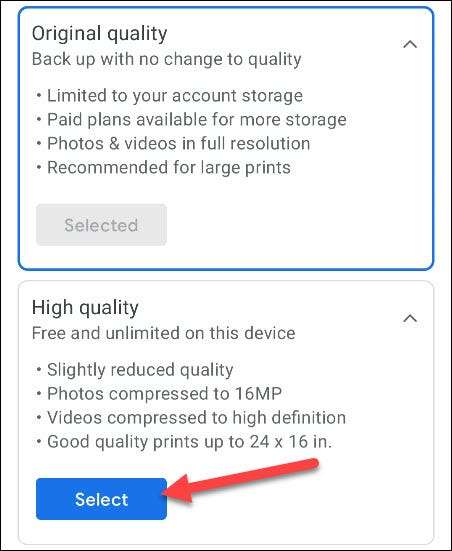 Ez közvetlenül a Google Fotók beállításaihoz vezet. Jelentkezzen be, ha még nem, és válassza ki az egyik feltöltési minőségi lehetőséget: