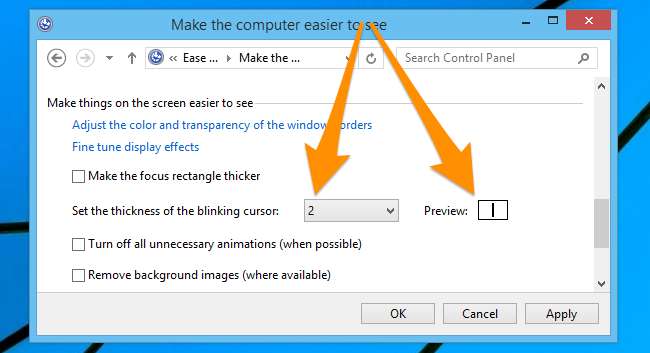 Ezután görgessen lefelé a „Villogó kurzor vastagságának beállítása” elemre, és változtassa meg a legördülő menüt másra.