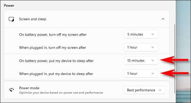 Ahhoz, hogy beállítsa, mennyi ideig tart a hordozható PC-nek, hogy aludjon, kattintson a legördülő menüre az "Az akkumulátor energiával, tegye az eszközt aludni", és válasszon egy időtartamot, például a "15 percet". Azt is választhat, hogy a "Soha" az alvás teljesen kikapcsolja az akkumulátort.
