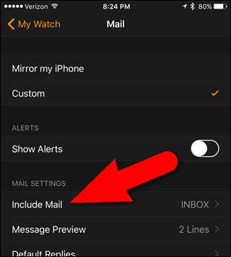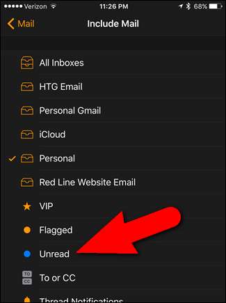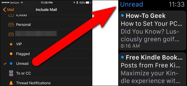 Az Apple Watch bármely beérkező vagy intelligens postafiókból származó leveleket jeleníti meg - de csak egyet. Beállíthatja „Minden postaládák” értékre, amely az összes fiók levelét mutatja, de ez borzasztóan rendetlen. Ha inkább csak olvasatlan e-maileket vagy megjelölt üzeneteket szeretne látni, ez lehetővé teszi, hogy csak ezt tegye.