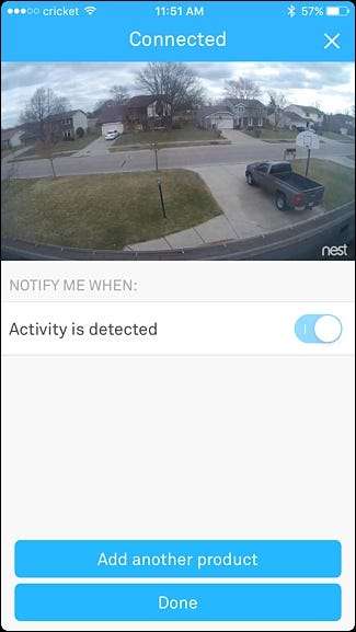Ezt követően a Nest Cam sikeresen csatlakozik. Innen megérintheti az „Újabb termék hozzáadása” lehetőséget, ha van egy másik Nest-eszköze, amelyet csatlakozni szeretne az új Wi-Fi-hálózathoz, vagy nyomja meg a „Kész” gombot.