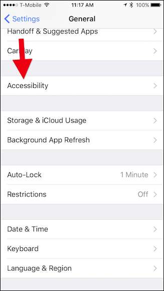 Az Általános beállításokban érintse meg a „Kisegítő lehetőségek” elemet.