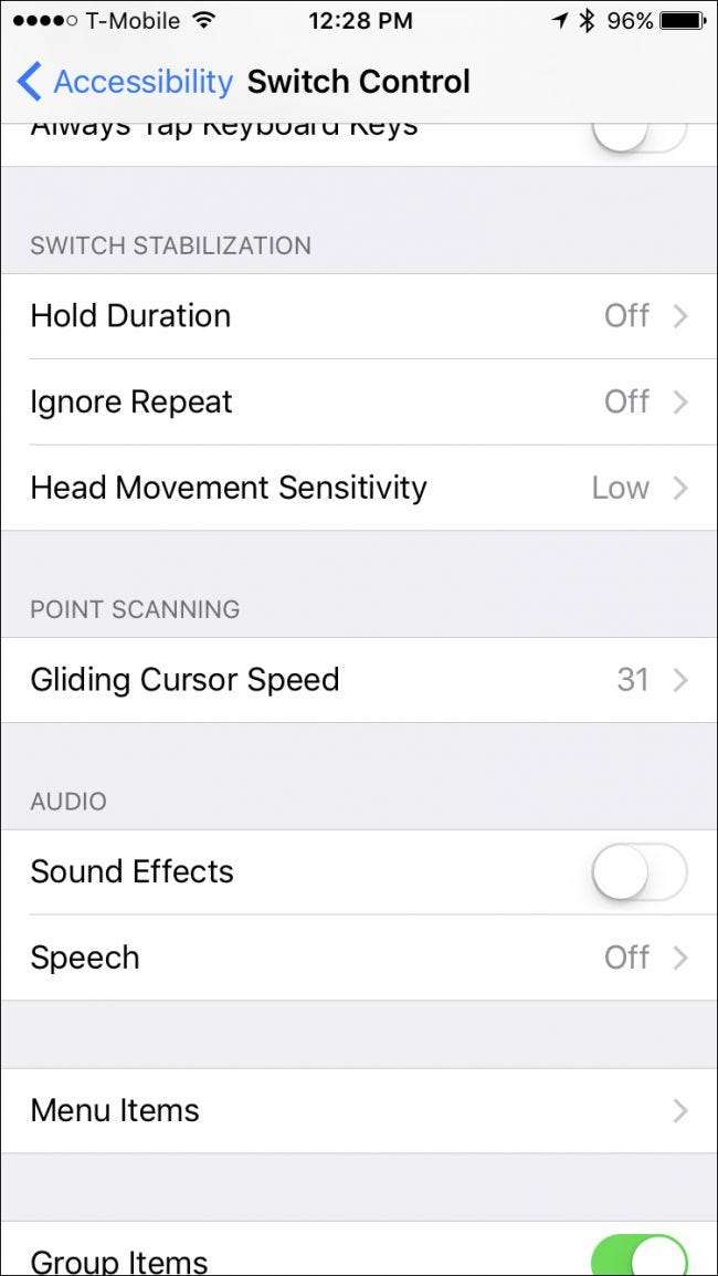 Játszhat a Switch Control opcióval, és beállíthatja a fejdőlés érzékenységét, azt, hogy a rendszer milyen gyorsan görgeti a képernyőn megjelenő elemeket stb.