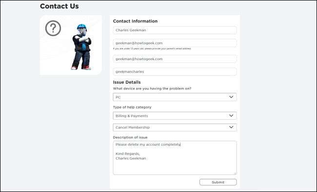 A Roblox nem biztosít automatikusan a Roblox-fiók törléséhez. Ehelyett a vállalat használatával kapcsolatba kell lépnie a ROBLOX ügyfélszolgálattal Online támogatási űrlap egy webböngészőben, és kérje meg őket, hogy töröljék fiókját.