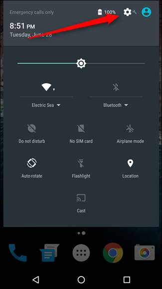 Az első dolog, amit meg kell tennie, húzza le az értesítési felületet, és nyomja meg a fogaskerék ikont, amely megnyitja a Beállítások menüt.