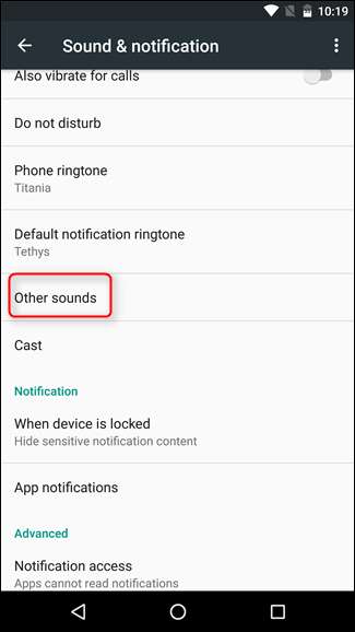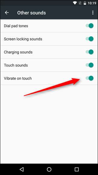 Görgessen kissé lefelé ebben a menüben, amíg meg nem jelenik az „Egyéb hangok” felirat, majd koppintson erre. Az utolsó lehetőség itt a „Rezgés érintéskor” - ennek bekapcsolása letiltja az összes érintéses visszajelzést az eszközön, kivéve a billentyűzeten.