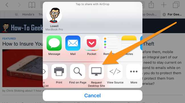 Az iOS 9 óta nagyon egyszerűen átválthat egy webhely asztali verziójára - ennek kétféle módja van. Az első a Megosztás (nyíl) menü használata, majd válassza az Asztali webhely kérése lehetőséget.